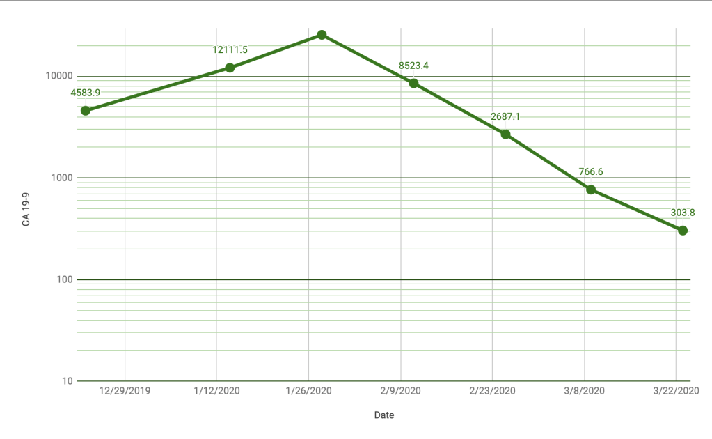The normal CA 19-9 range in a healthy person is 0-37 units per milliliter. You can’t see the label on that top value, but it was 25,552.7 units per milliliter on January 28 and as of March 23 it was 303.8 units per milliliter. That is a significant change.
